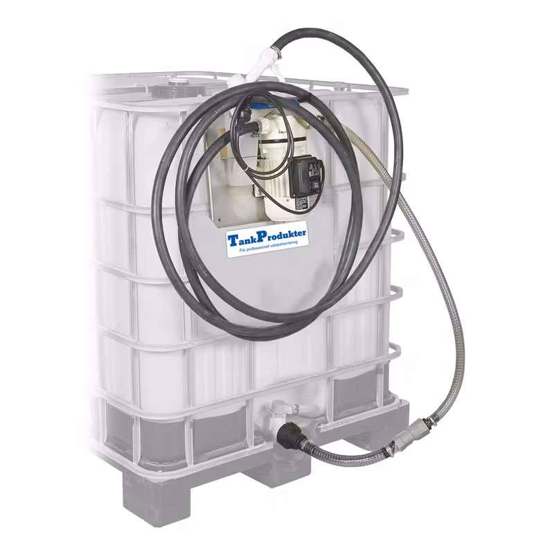 Pumputrustning med membranpump avsedd för IBC containers. Utrustningen är anpassad för pumpning av Urea/AdBlue och andra aggressiva media anpassade för materialen i pumpen. Pumpen bör inte köras mot stängd ventil eller utan vätska under någon längre tid. Elmotor skyddsklass IP44 med on/off brytare. Sughöjd ca 2 m. Plåtdetaljer i elförzinkat material för montage av pumputrustningen på containern eller på annan plats. Anslutningsgänga utv. G1” för in och utlopp.