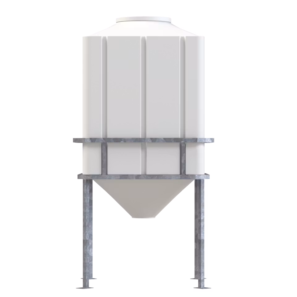 Rektangulär tank med konisk botten 2000 lit. Polyeten, lämplig för användning i vattenbehandlings eller kemikalieindustrin, jordbruk och livsmedelsproduktion. Naturell konisk öppen . Botten D 200 mm, kona 45°.